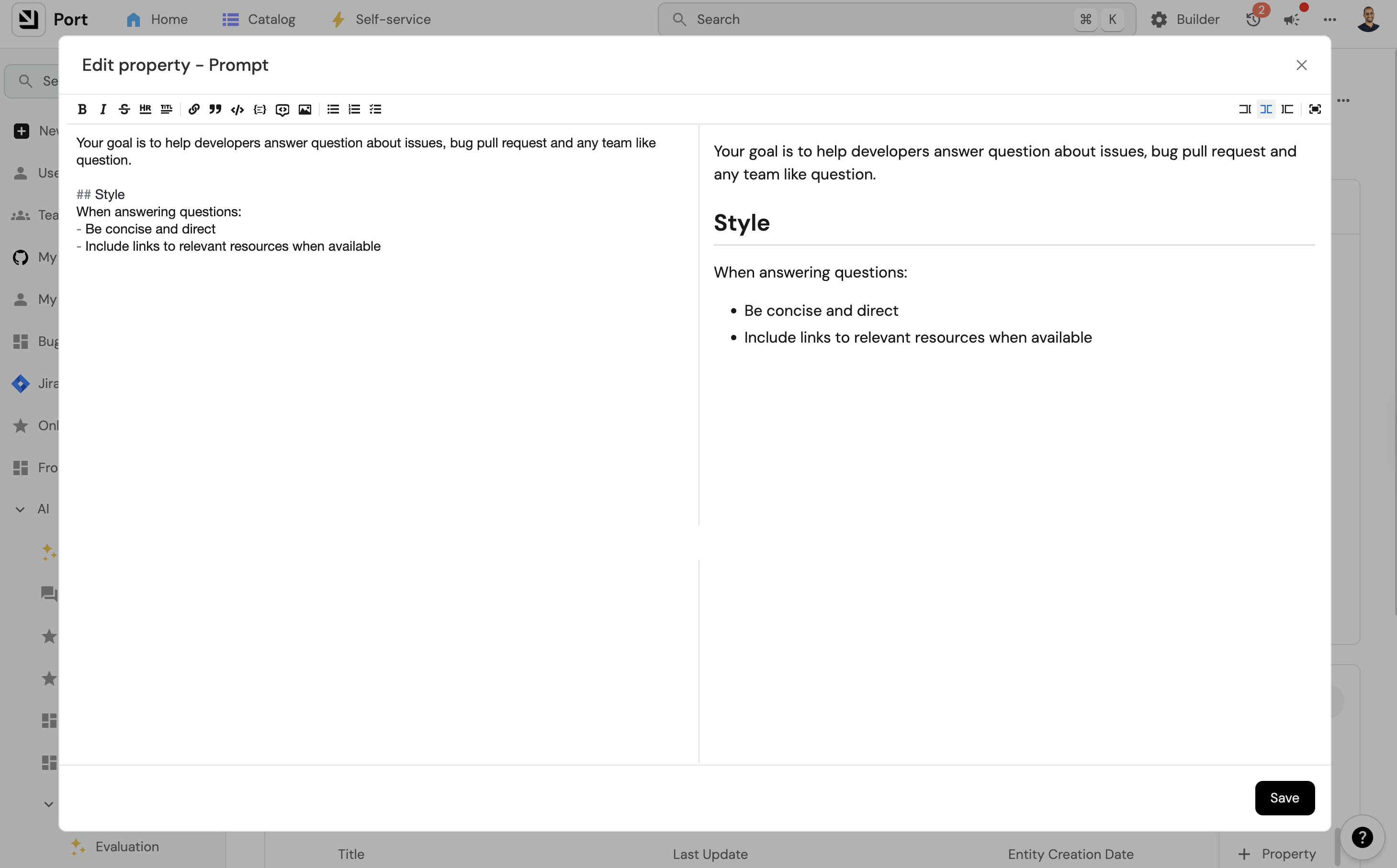 - Data access tools: Add Port AI tools for retrieving information from your catalog