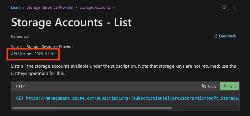 apiVersionfield is the Azure API version to use to fetch the resource. This field is required for all resources. For example, the API versions for thestorageAccountresource was found in the Storage Account Rest APIapiVersion: "2023-01-01"