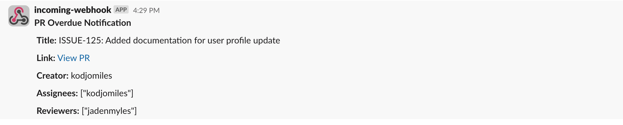 Hereโs an example of the Slack message youโll receive when a PR has been open for more than 3 days: