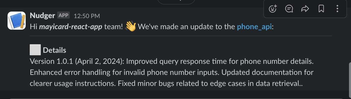 "text": f"Hi _*{title.lower()}*_ team! :wave: We've made an update to the *{api}*:",