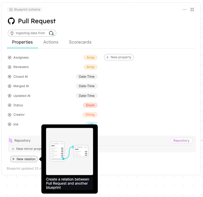 Head back to the Builder, choose the Pull Requestblueprint, and click onNew relation: