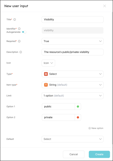 Click on Next, and add the following inputs:NameandVisibility.To create the Nameinput field:-