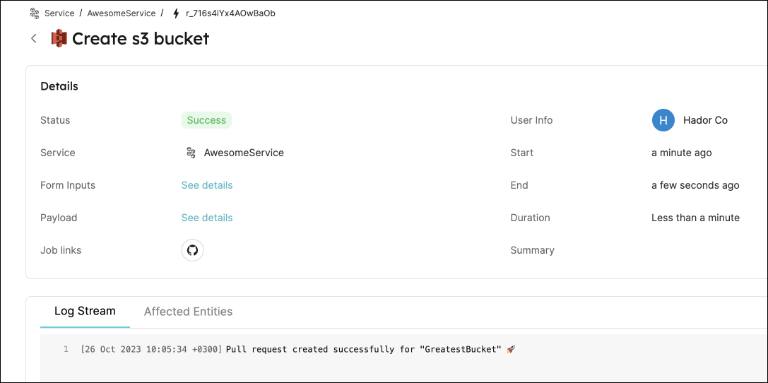 This page provides details about the action run. We can see that the backend returned Successand the pull-request was created successfully: