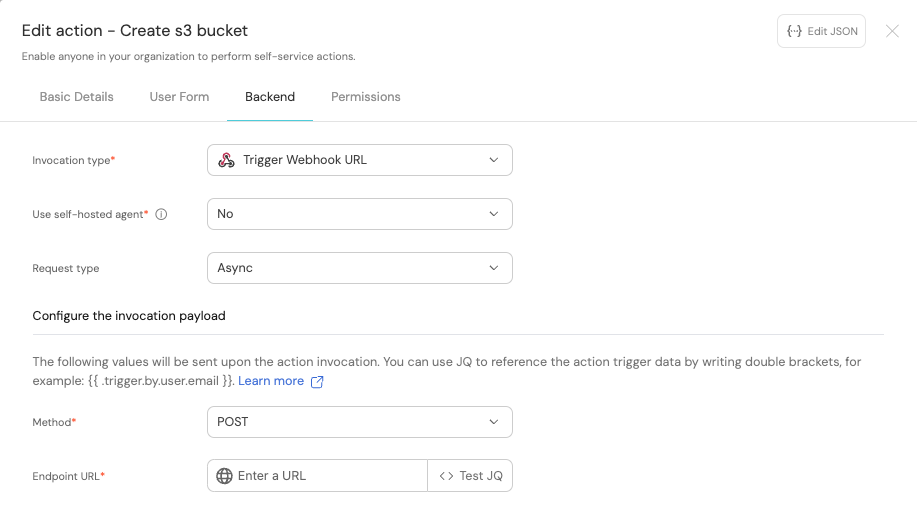 Now we'll define the backend of the action. Port supports multiple invocation types, depending on the Git provider you are using.