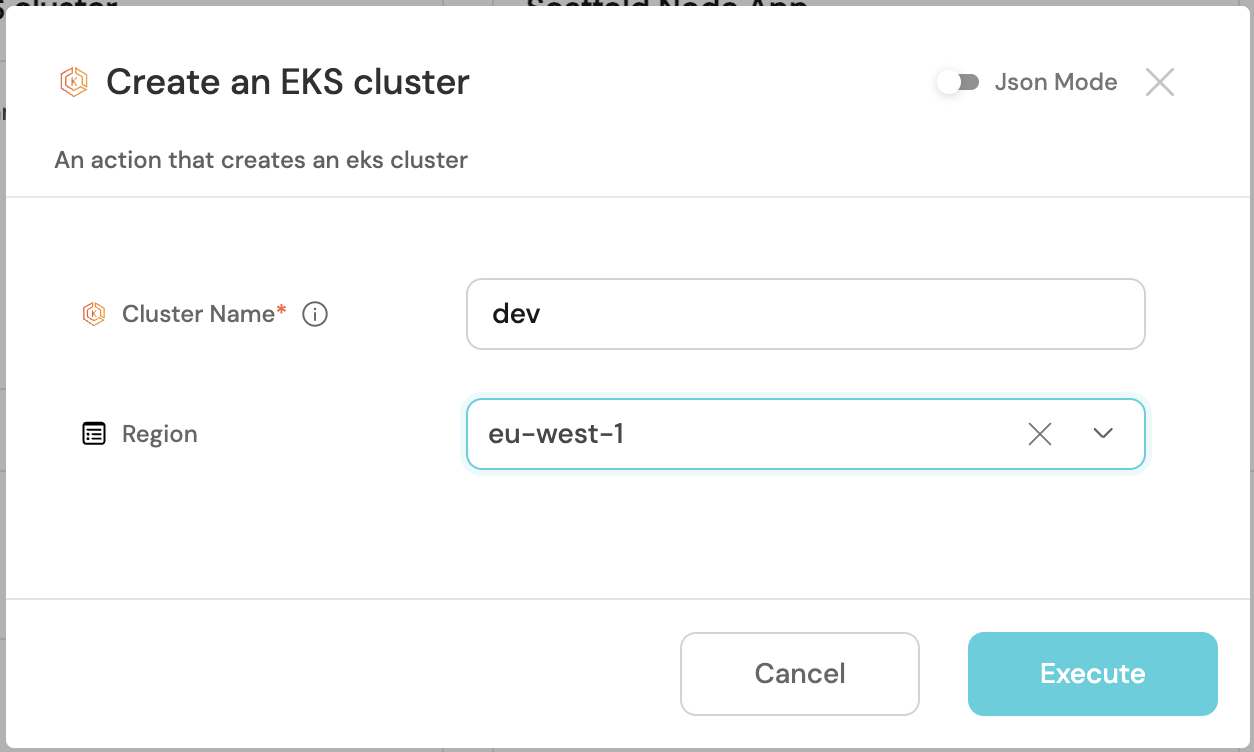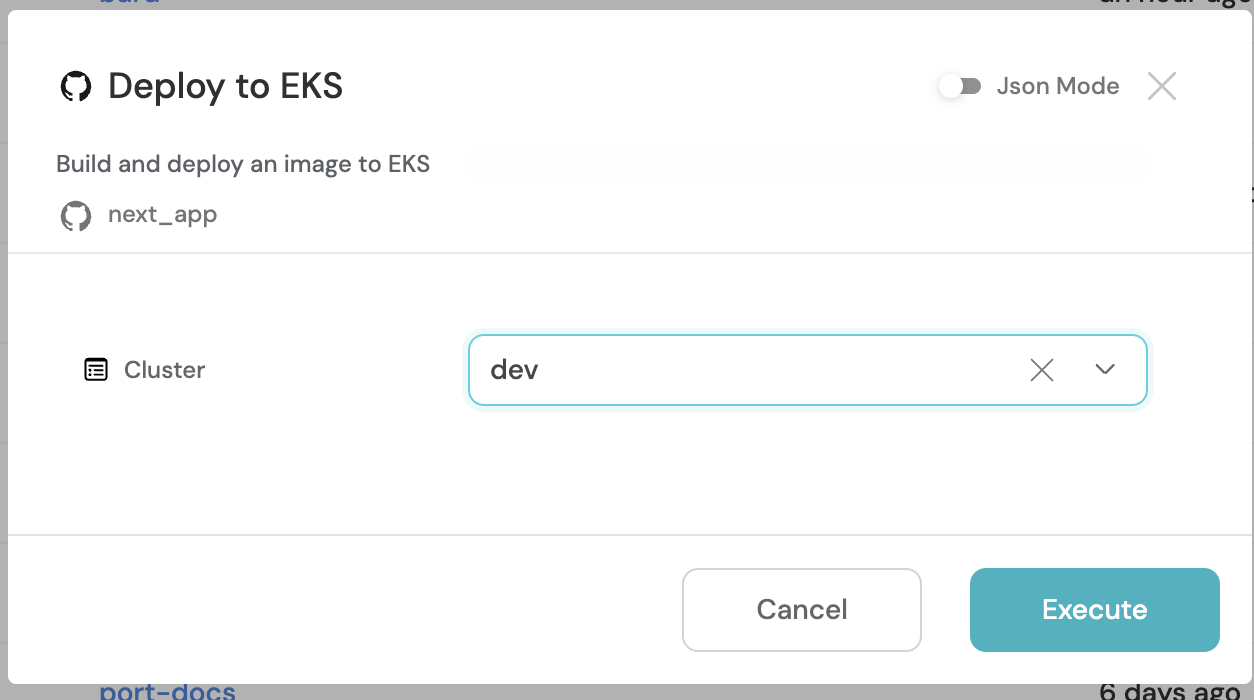 - On the self-service page, create a Port action against the Repositoryblueprint calledDeploy to EKS.