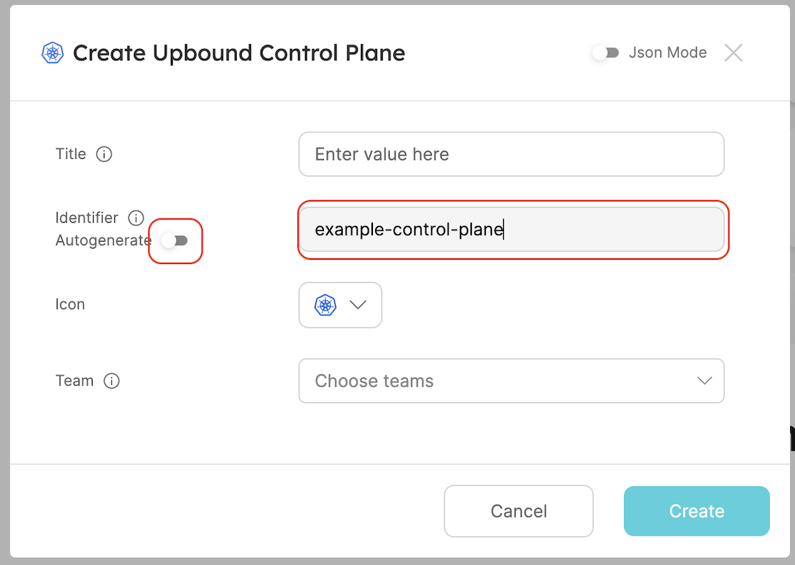 - In the identifierfield, insert the Upbound control planeidentifierwhich we saved earlier and click create (do this step multiple times if there are more than 1 control plane).