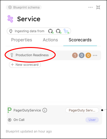 Say we want to ensure each service meets our new requirements, with different levels of importance. Our Service blueprint already has a scorecard called Production readiness, with three rules.