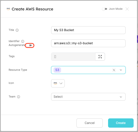 The entity's identifier is the AWS ARN of the AWS resource. Ensure sure you toggle off the Autogenerate for the identifier.