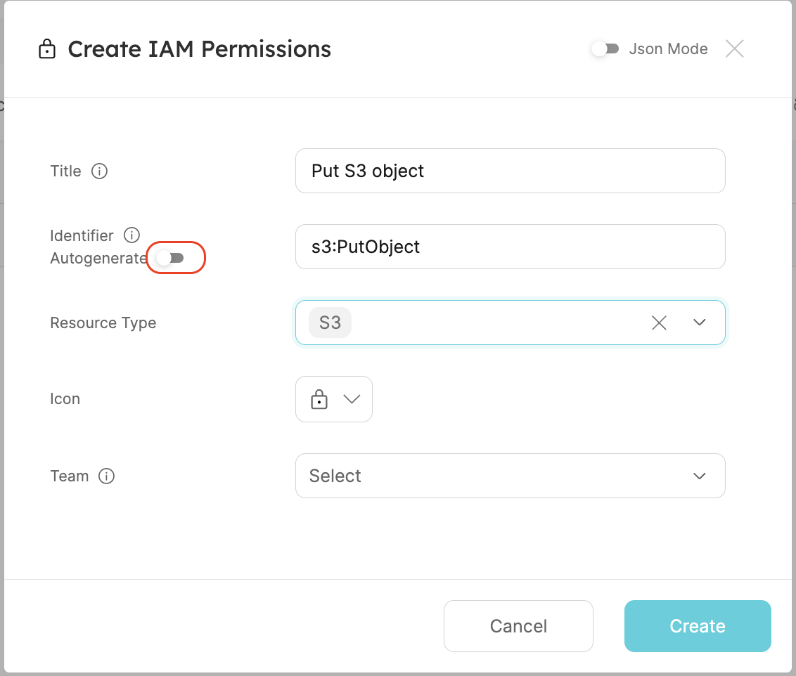 The entity's identifier should be the IAM permission you want to allow (e.g., s3:PutObject). Ensure you toggle off the Autogenerate option for the identifier.