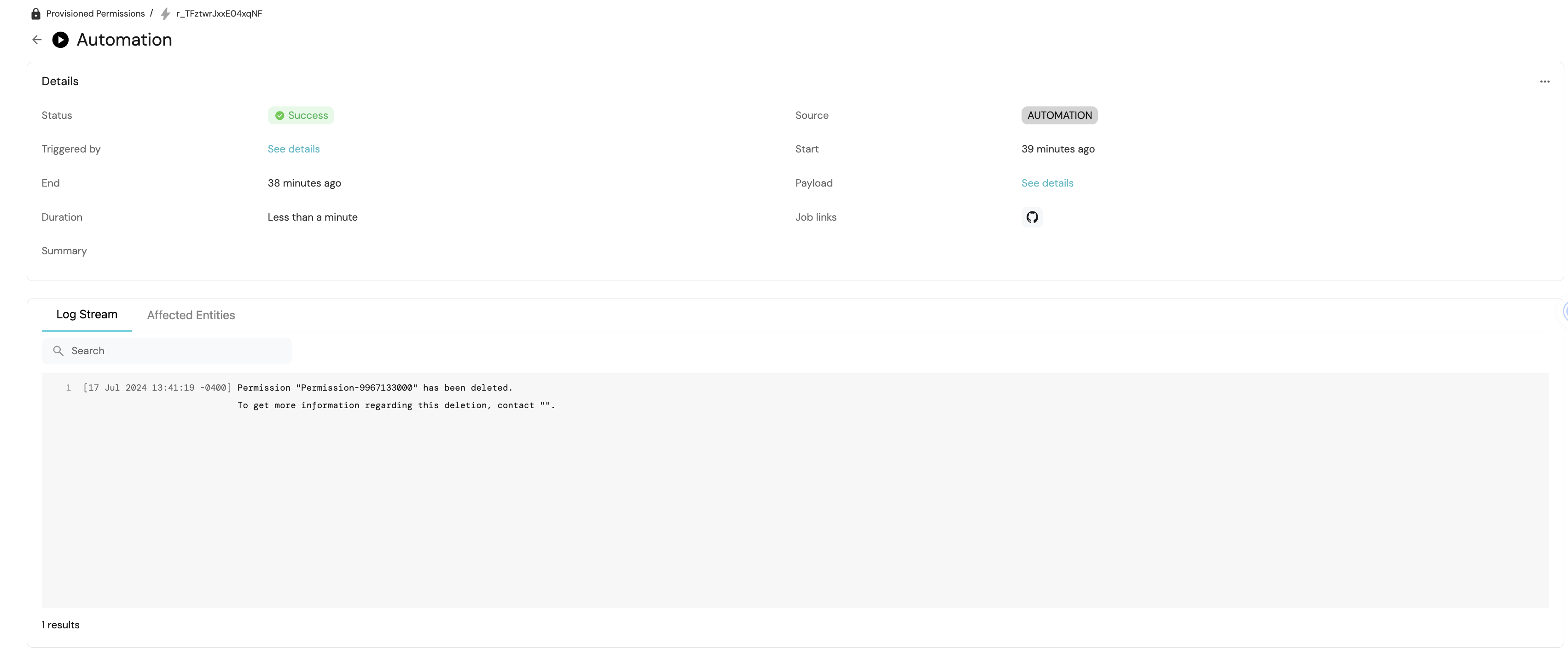 The action will also create a new Provisioned Permissions entity, visible in the Provisioned Permissions catalog page.