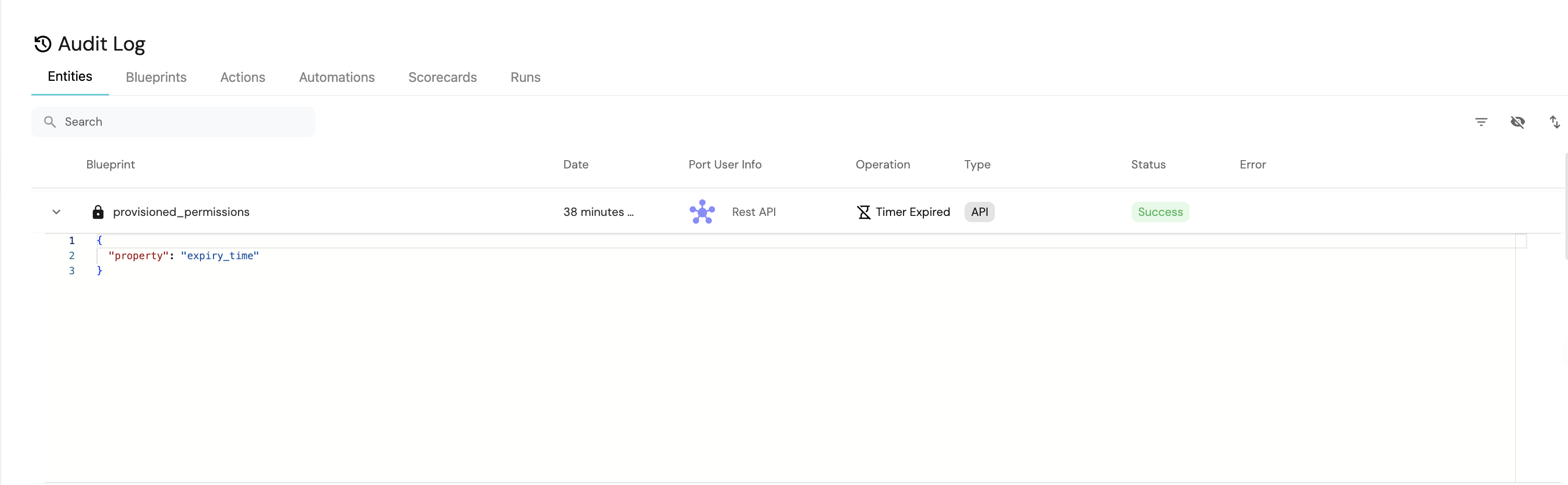 For instance, your HR system can automatically trigger an event to revoke permissions via Port when an employee departs the company. In this guide, we will utilize the timer expired event to initiate the revoke permissions action, ensuring temporary permissions expire as required by your security or compliance teams.