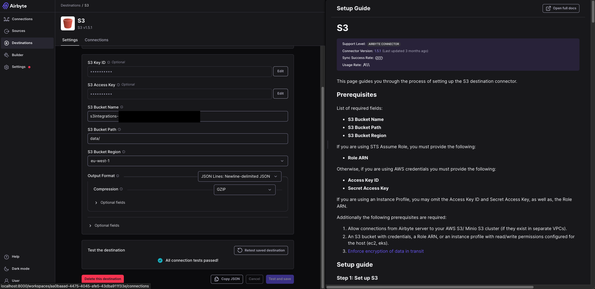 Click Test and saveand wait for Airbyte to confirm the Destination is set up correctly.