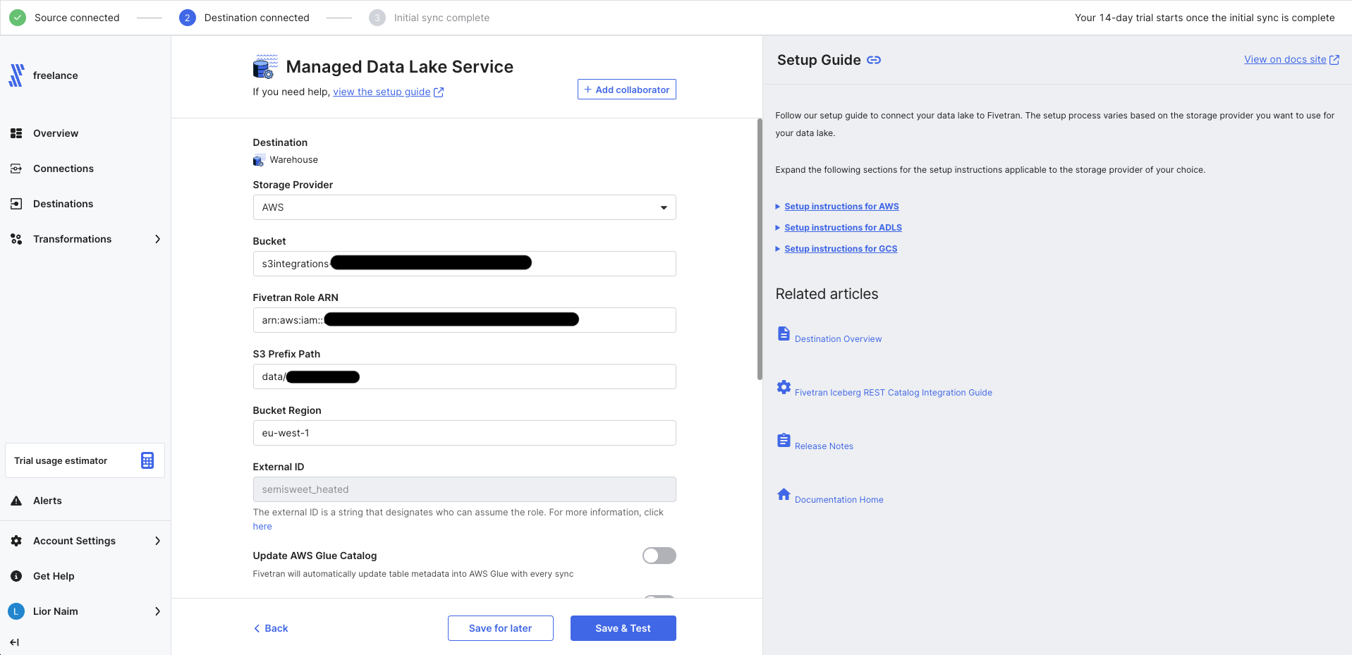 In order to configure your Fivetran ARN Role, you will need to provide us the "External ID" that Fivetran will produce in the UI when configuring the S3 destinstaion. For that purpose, you can start creating the Destination, copy the External ID value, and Click on "Save for later". You can resume the Destination setup once the rest of the details will be provided by Port.