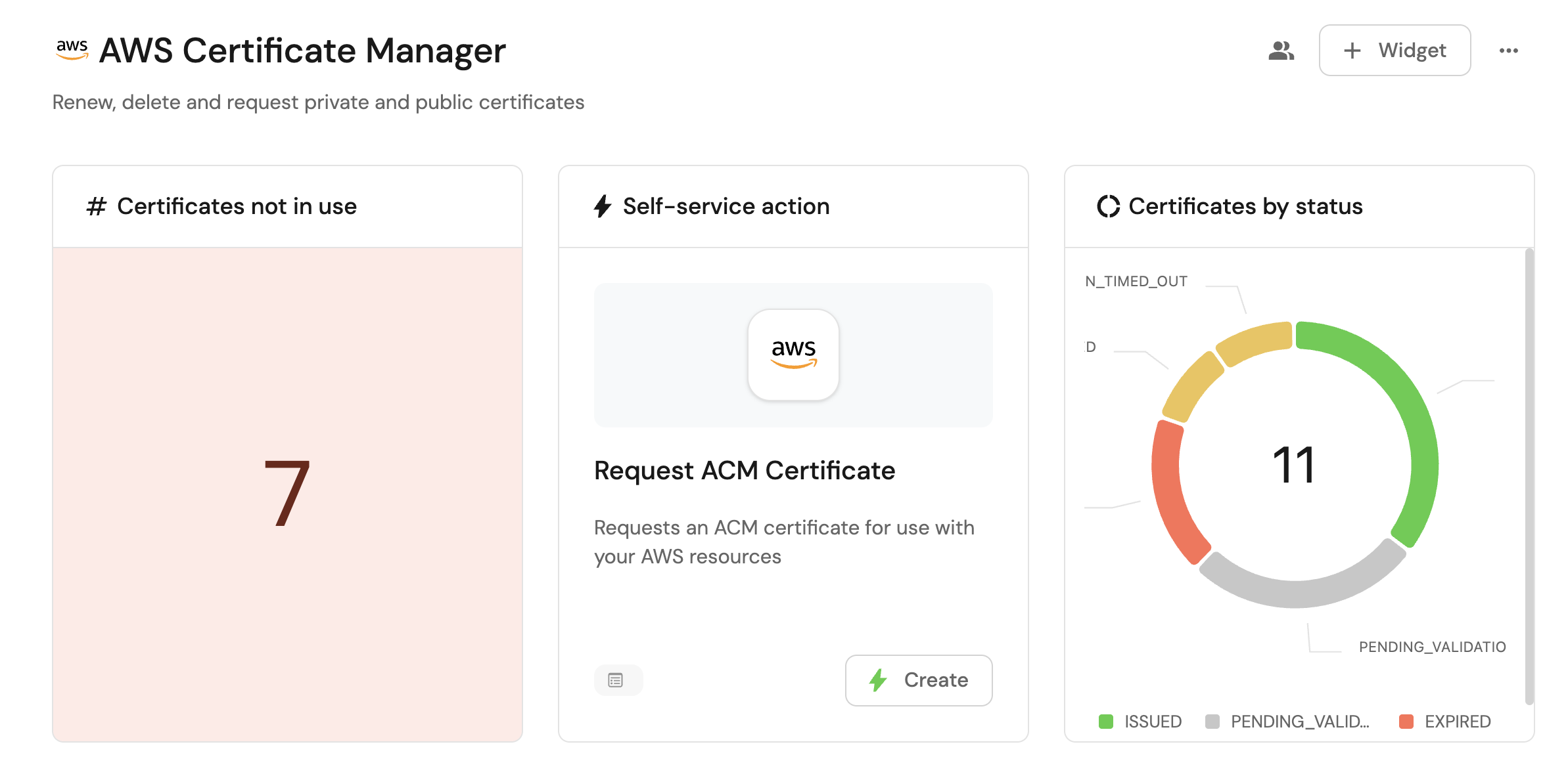 With your data and actions in place, we can create a dedicated dashboard in Port to visualize all ACM certificates by status, usage, and expiration. In addition, we can trigger actions (request new certificate, renew, delete) directly from the dashboard.