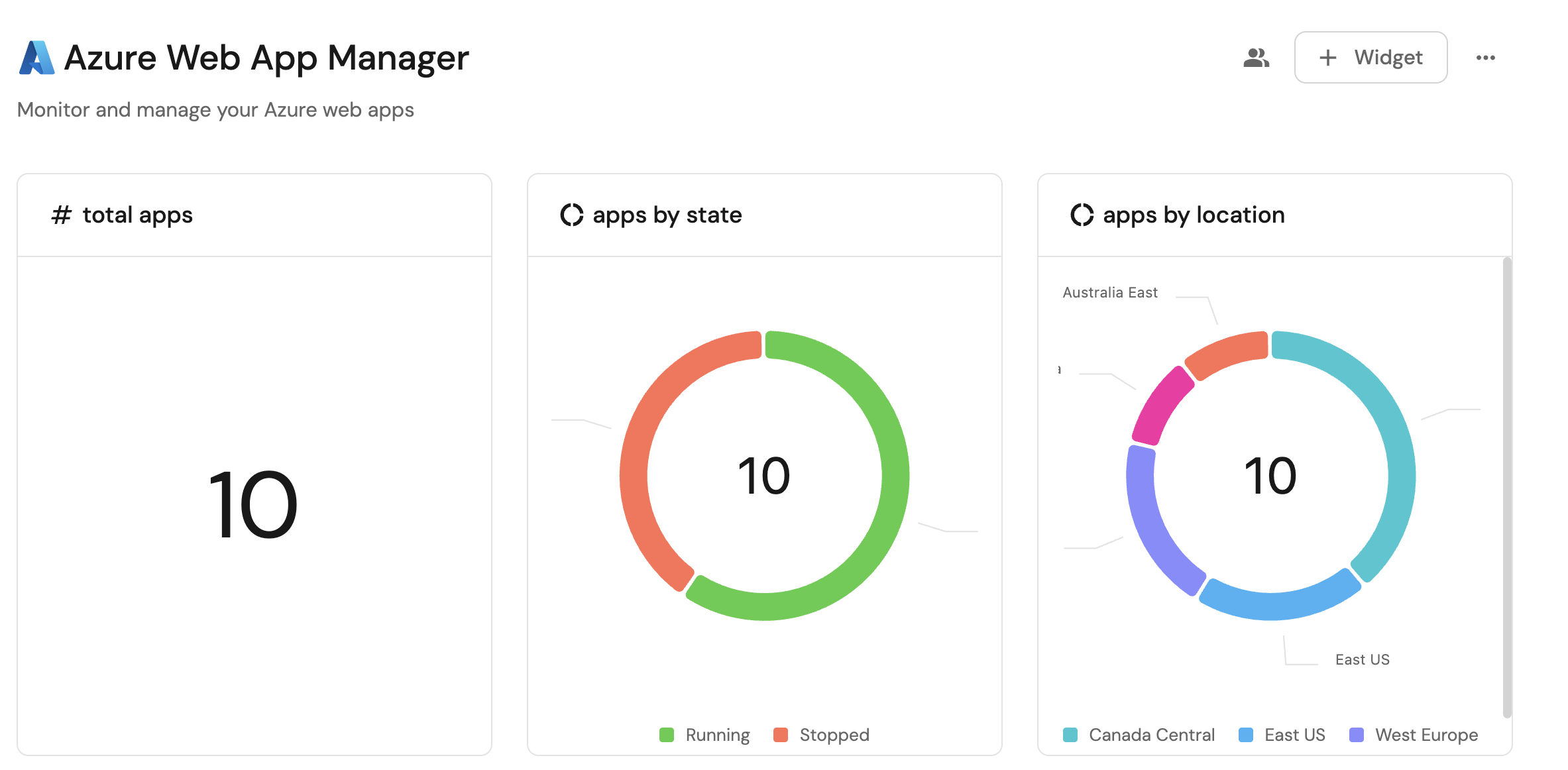 With your data and actions in place, we can create a dedicated dashboard in Port to visualize all Azure web apps by status, location, and resource group. In addition, we can trigger actions (start, stop, restart) directly from the dashboard.
