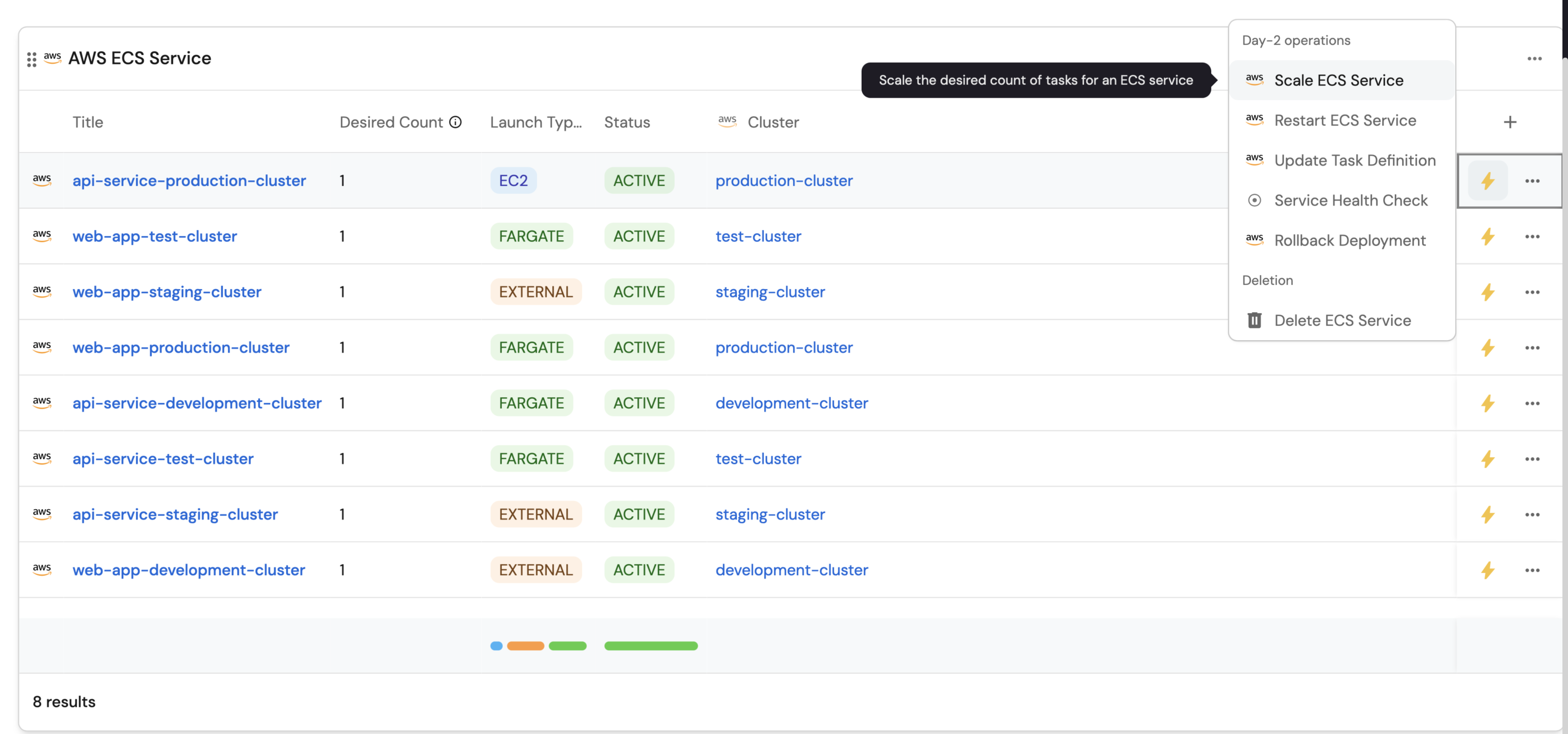 - Set up self-service actions to manage ECS services (scale, restart, deploy, health check, rollback, and delete).