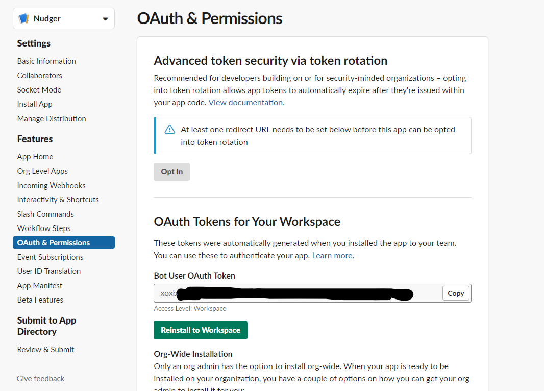 - Navigate back to the OAuth & Permissions page. You'll see an access token under OAuth Tokens for Your Workspace that you will use in the BOT_USER_OAUTH_TOKENGitHub secret.