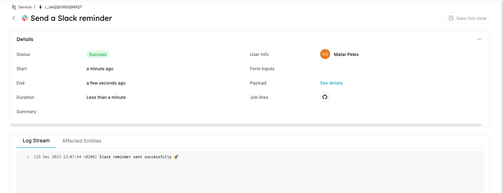 This page provides details about the action run. As you can see, the backend returned Successand the repo was successfully created:
