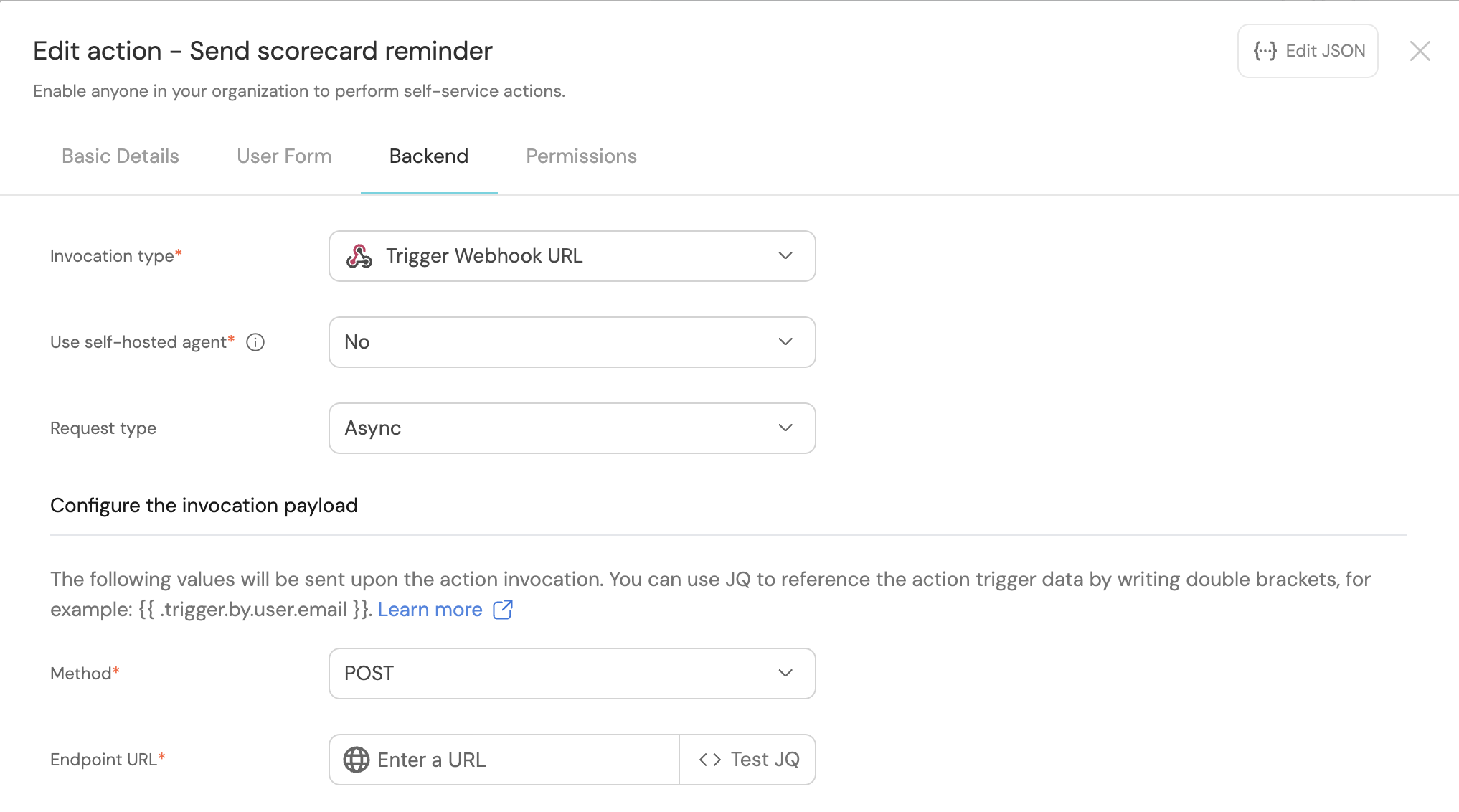 - Back in Port, edit your action and in its backendstep paste the webhook URL in theEndpoint URLfield.