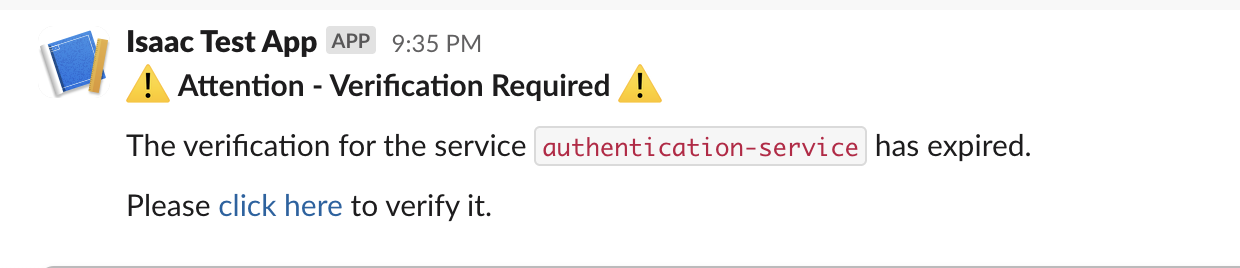 Observe a service entity whose verification timer has expired. The Slack message may look like this:
