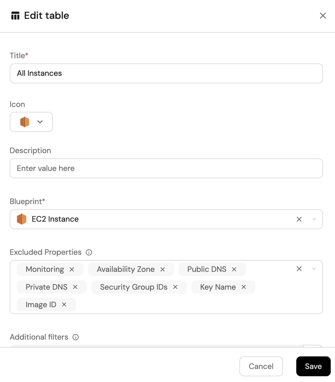 In the top right corner of the table, click on Manage Propertiesand add the following properties:- Instance State: The current state of the instance.