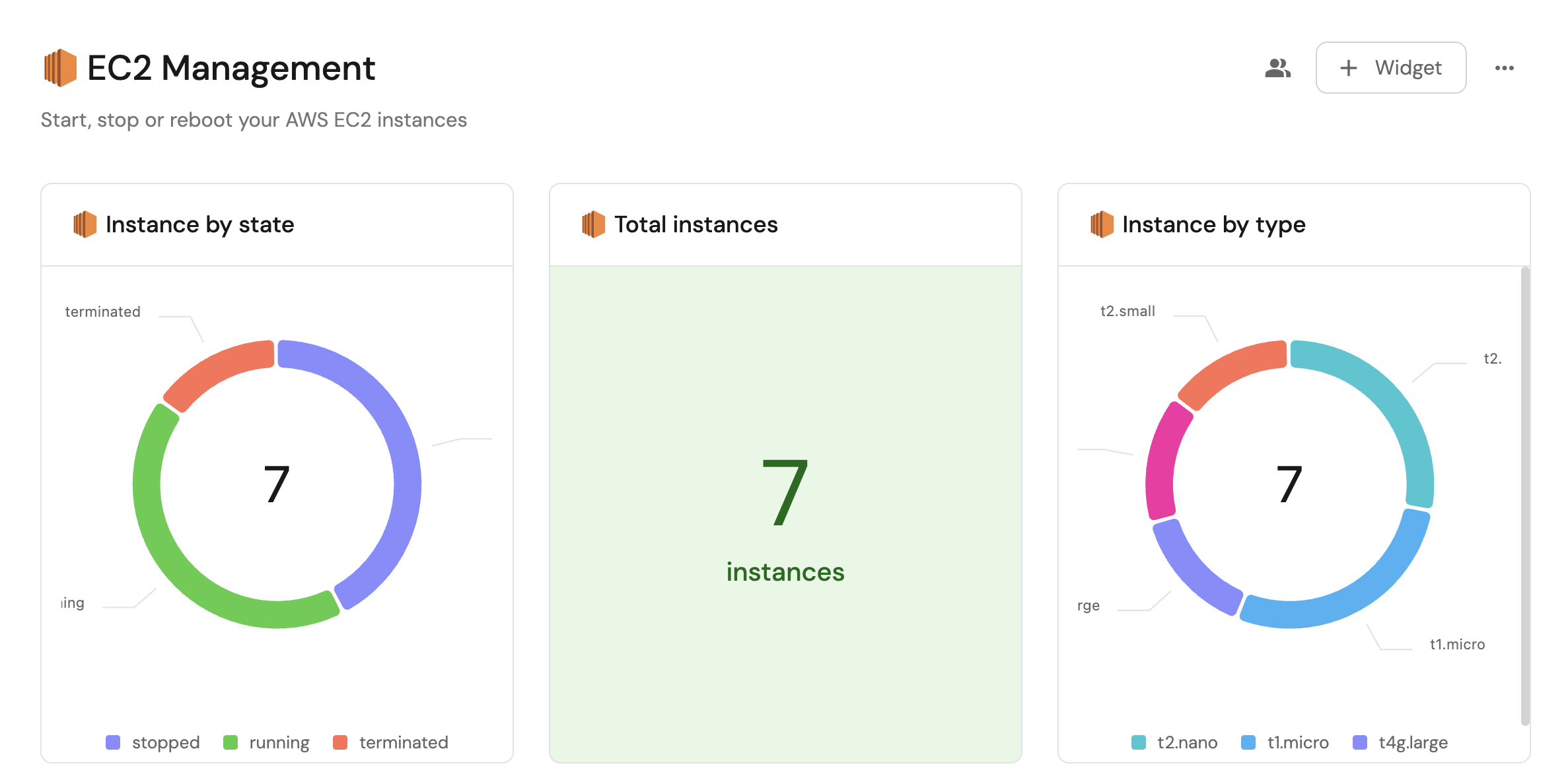 With your data and actions in place, we can create a dedicated dashboard in Port to visualize all EC2 instances by state, type, or account using customizable widgets. In addition, we can trigger actions (start, reboot, terminate) directly from the dashboard.