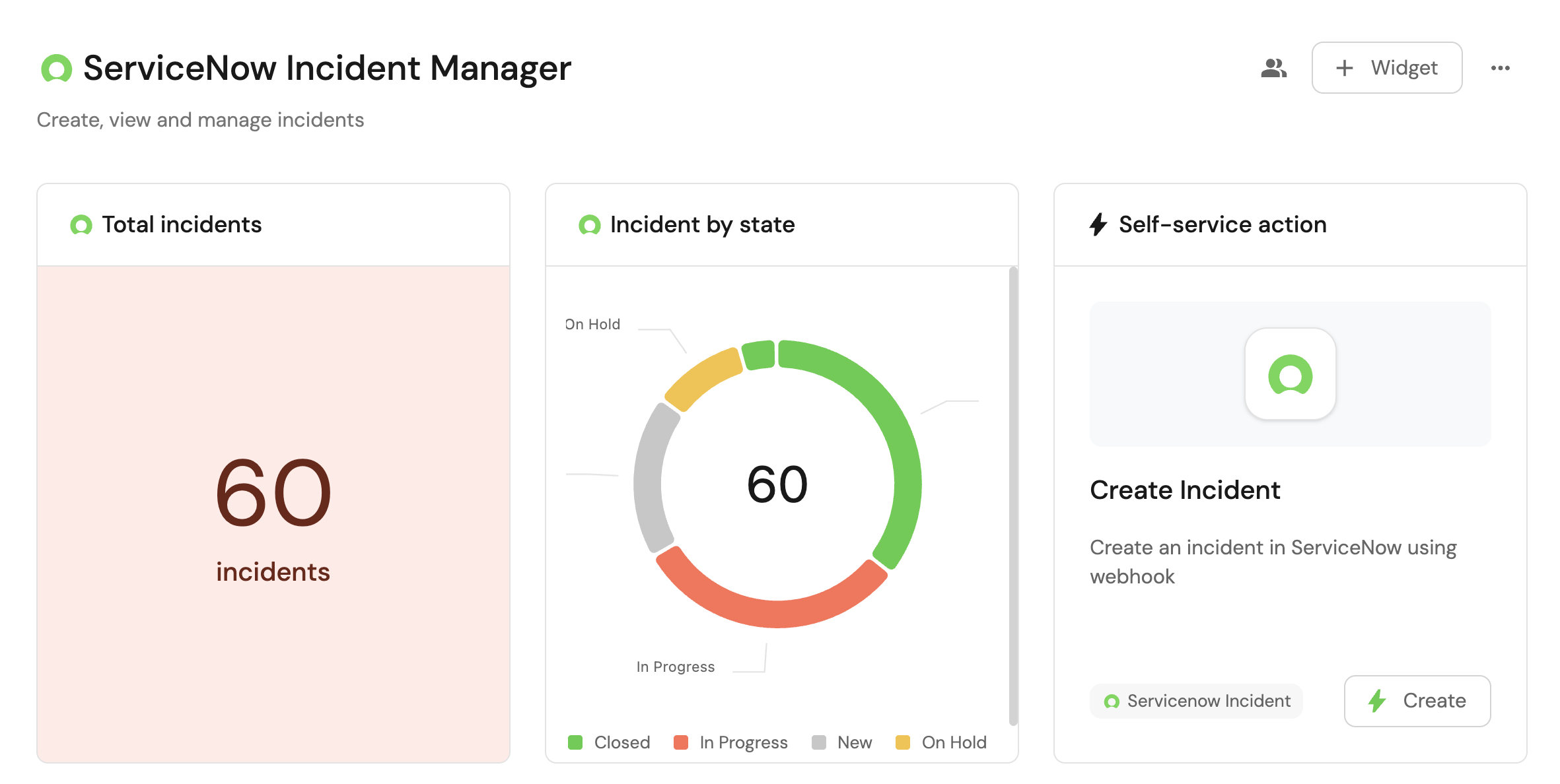 - Monitor the status and health of all ServiceNow incidents from a centralized dashboard.