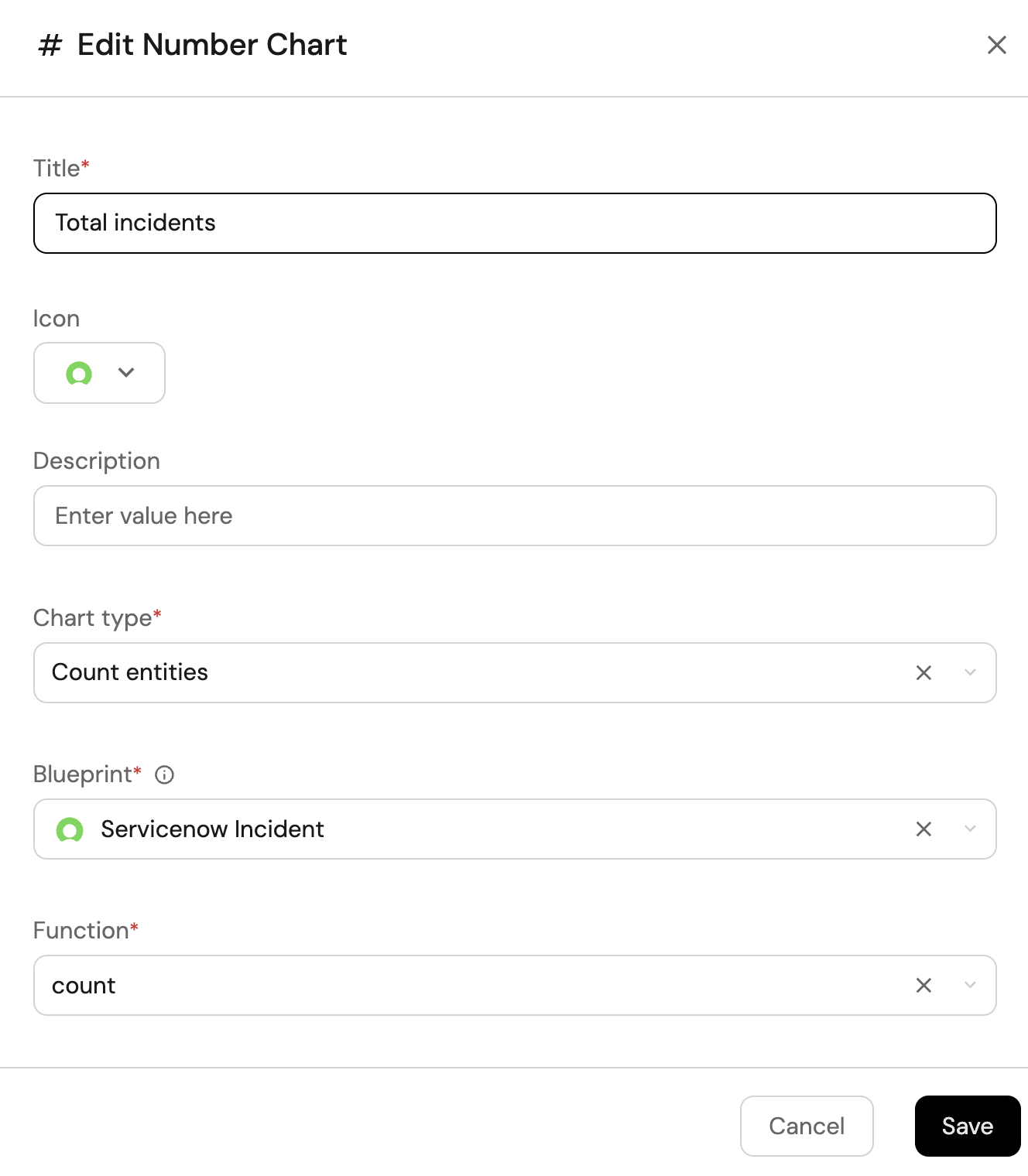 Select Count entitiesChart type and choose ServiceNow Incident as the Blueprint.