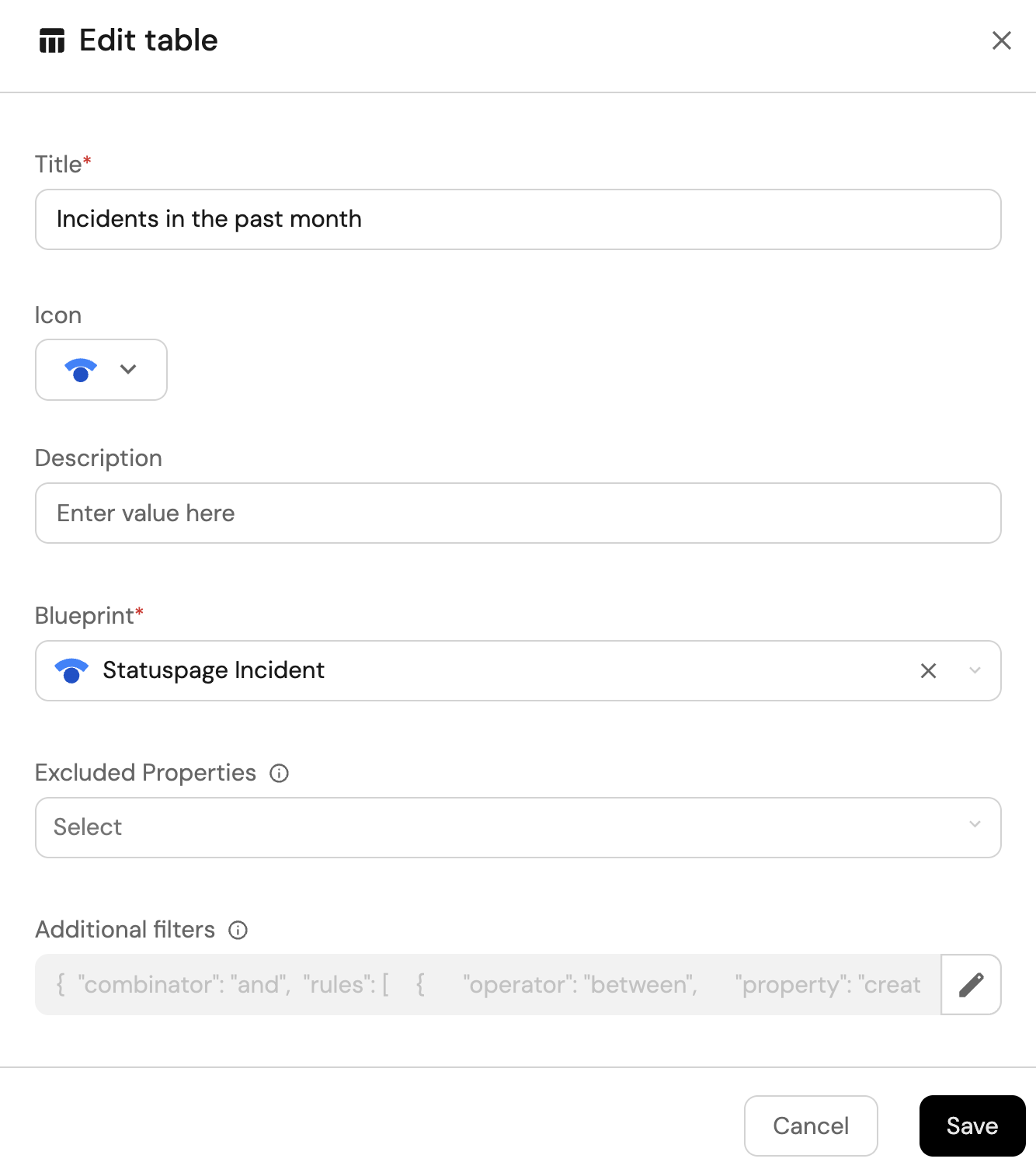In the top right corner of the table, click on Manage Propertiesand add the following properties:- Status: The current status of the incident.