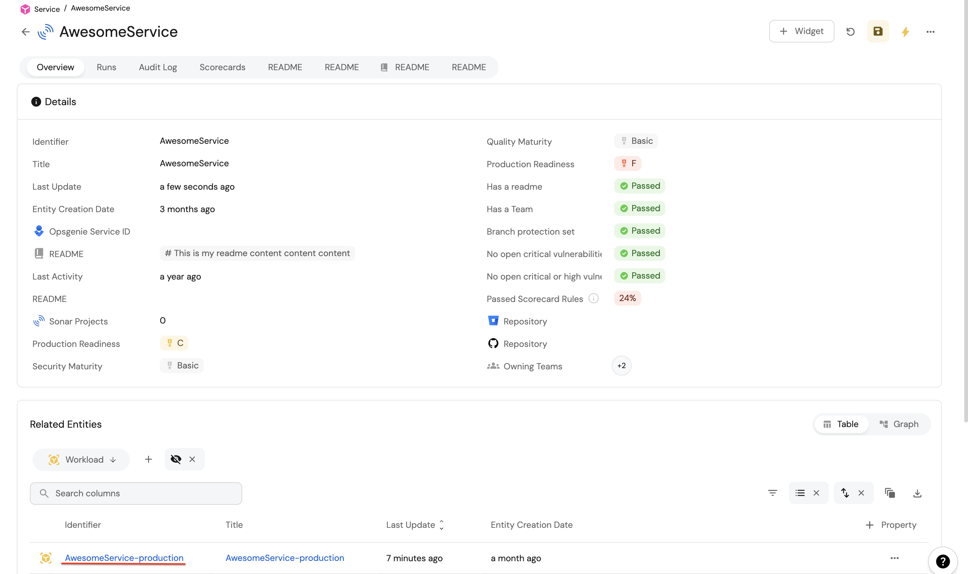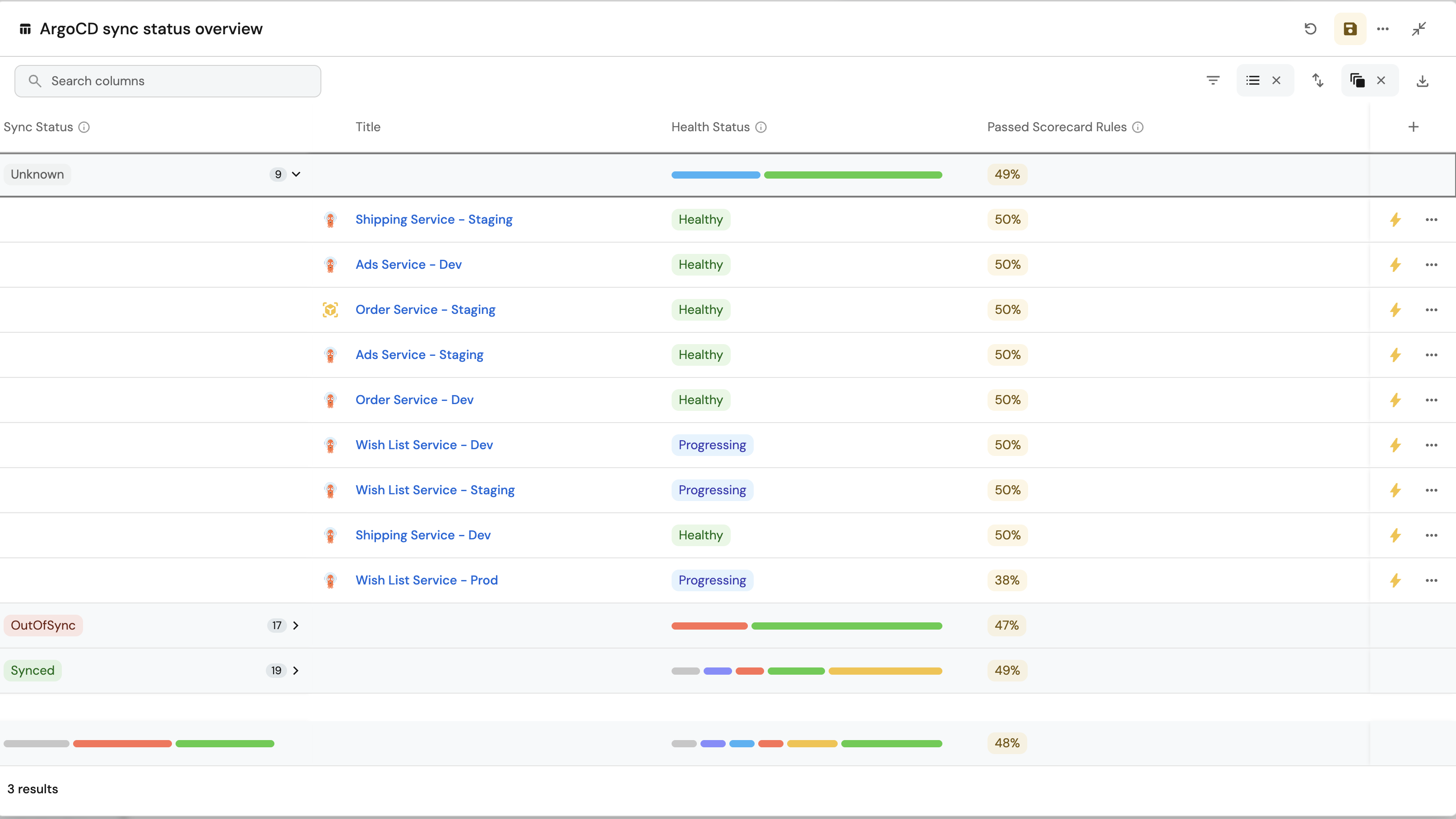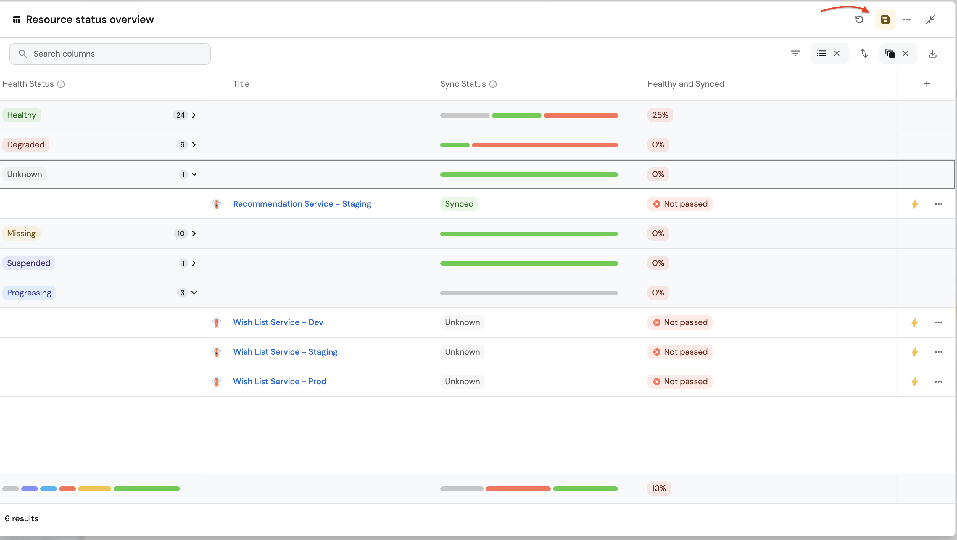 Go to the services page of your software catalog. Click on the servicefor which you created the deployment. At the bottom of the page, you will see theworkloadrelated to this service, along with all of their data:
