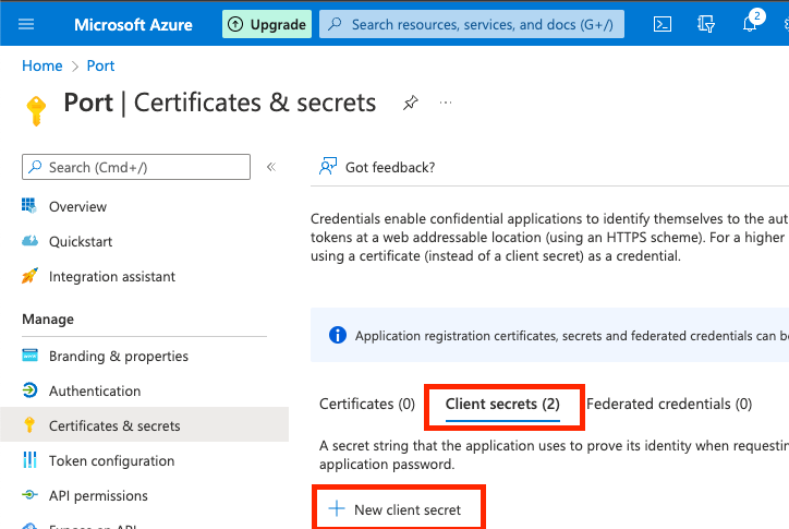 Be sure to mark on your calendar the expiration date of the secret. The secret needs to be replaced before its expiration, otherwise login to Port will be disabled.